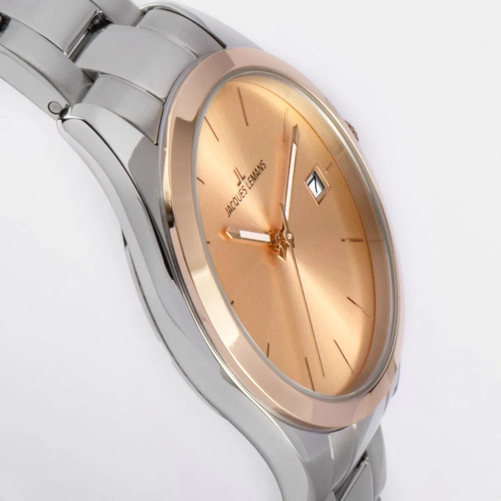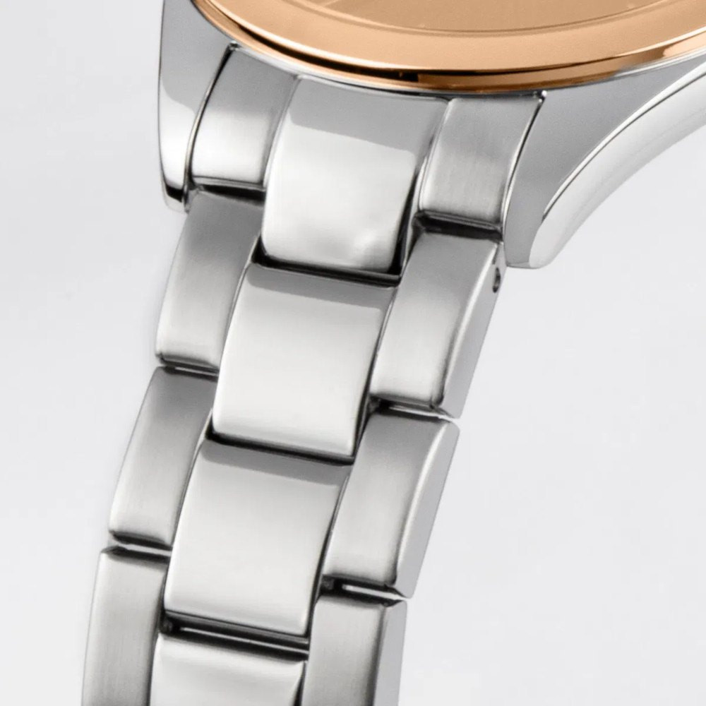 Ezüst színű kényelmesen vékony óratok, rozé arany színű PVD bevonatú lünettával.