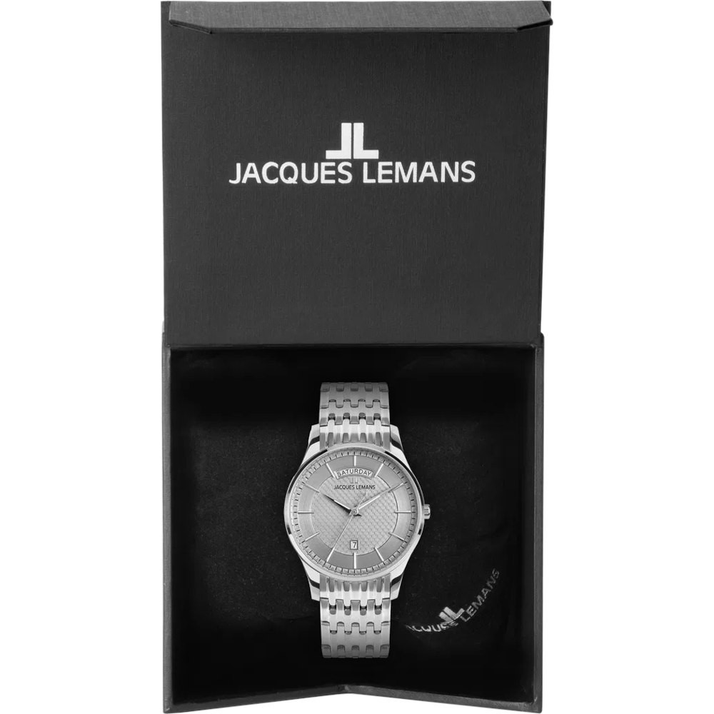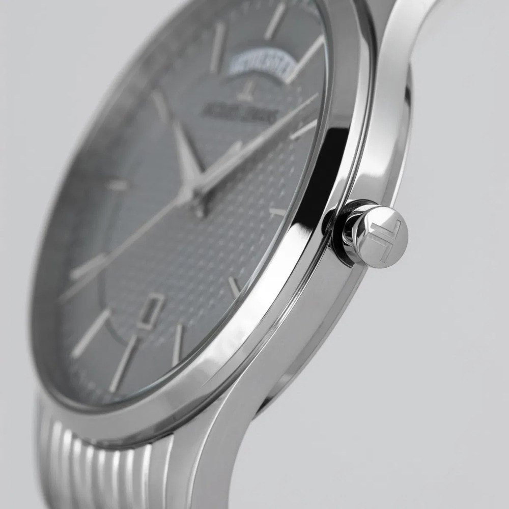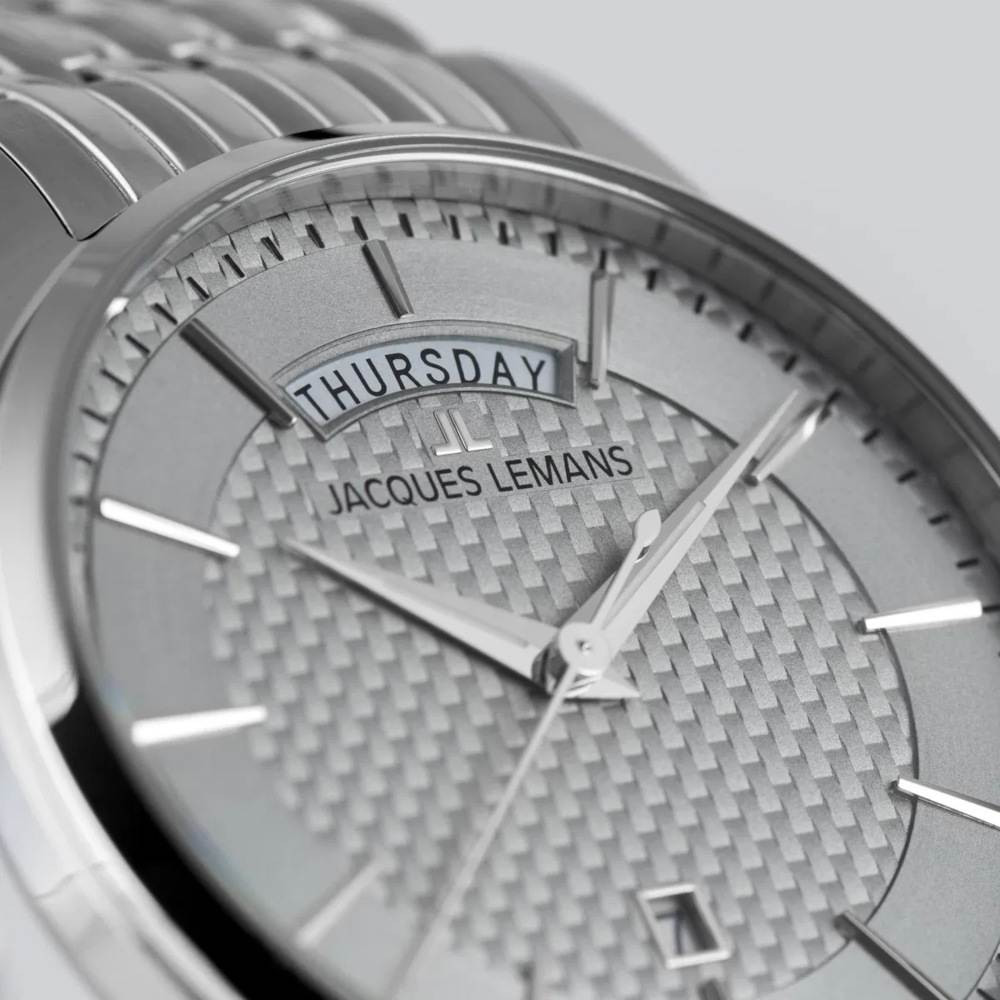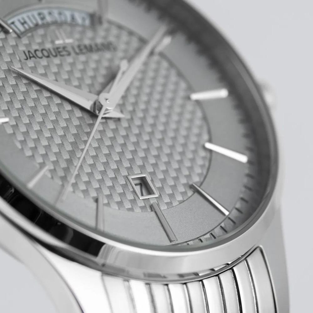 Ezüstszürke színű dombornyomott mintázatú számlap, "day-date" kijelzéssel.