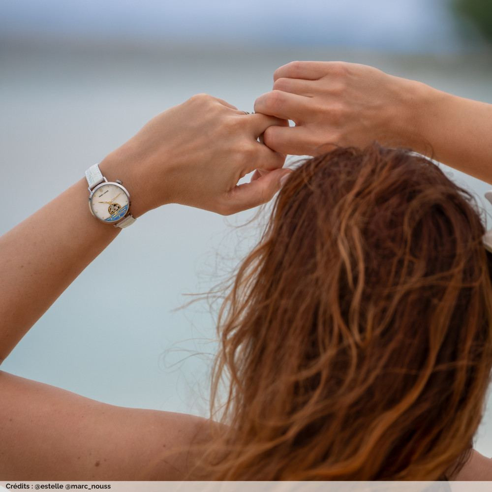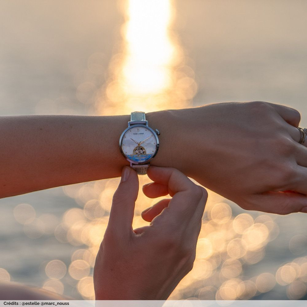 "Open heart", gyöngyház bevonatú, sugarasan bordázott különleges számlap.