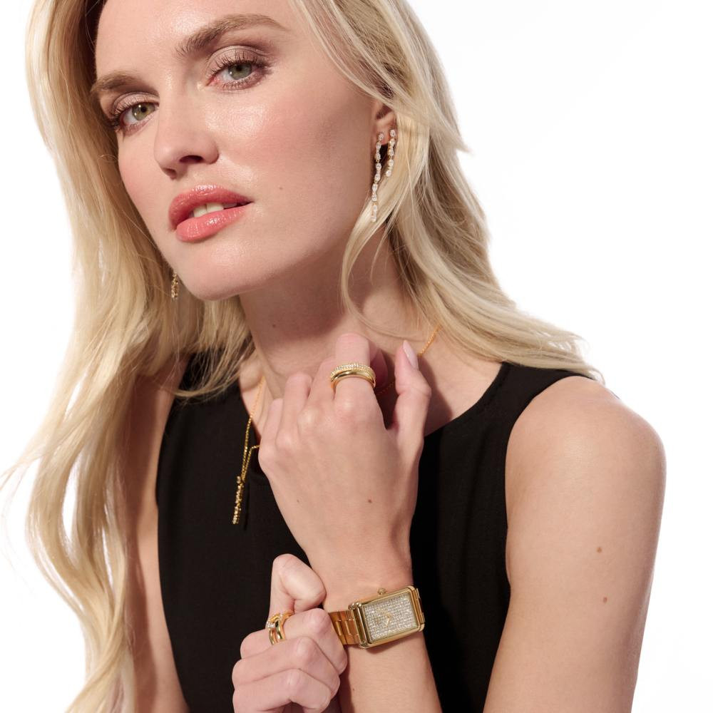 18 karátos sárga arany bevonatú (IP bevonat) rozsdamentes acél szíj, polírozott/matt felületkezeléssel.